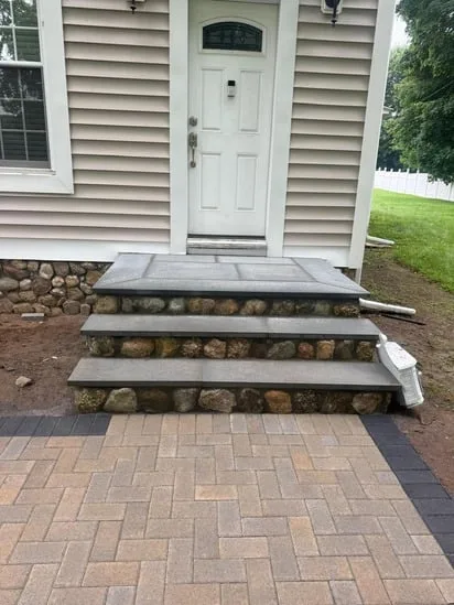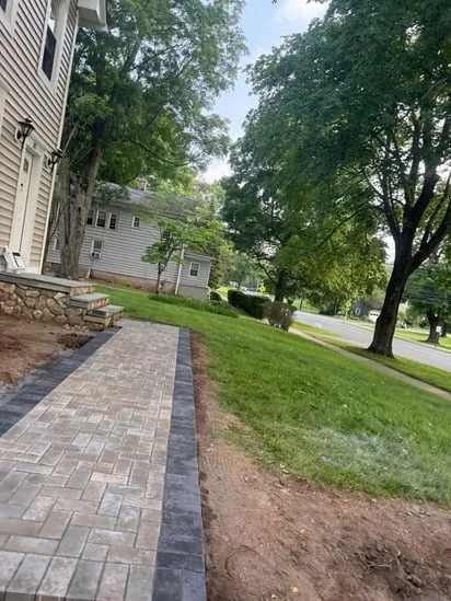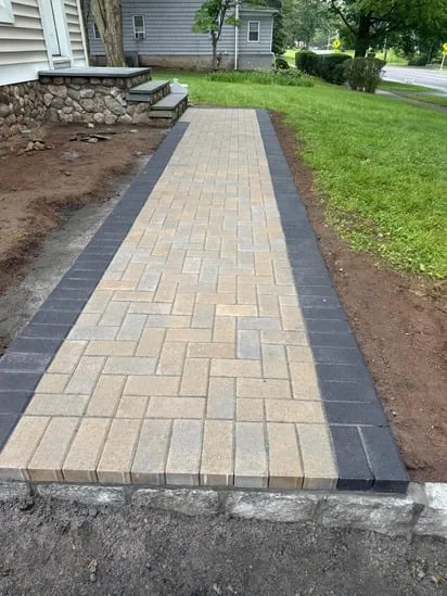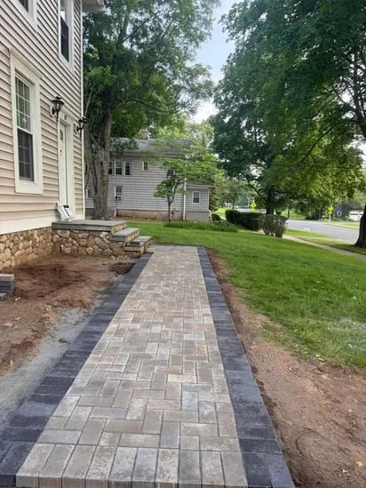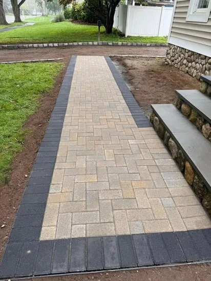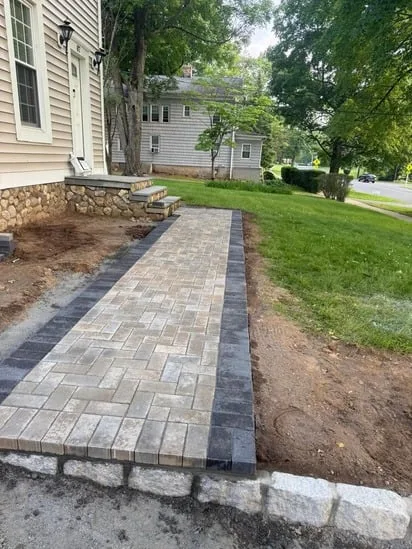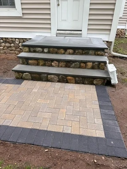 This project involved the installation of a paver walkway integrated with stone steps to improve access to the home. Initially, the existing ground was prepared and leveled to ensure proper drainage and long-term stability. Subsequently, a herringbone-pattern paver surface was installed, framed with a contrasting border to define the pathway. In addition, natural stone steps were constructed to connect the walkway to the entryway, providing a cohesive transition between elevation changes. As a result, the finished layout delivers a durable, well-structured path that aligns with the surrounding landscape and existing stone foundation.
