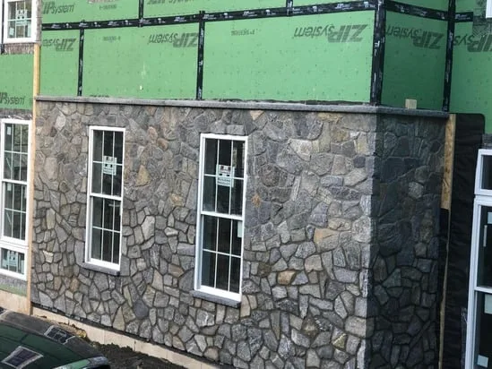 This project demonstrates a detailed stone veneer installation applied to an exterior facade. Moreover, the work highlights careful stone placement, consistent joint alignment, and a clean integration around window openings. Additionally, the installation progresses over a ZIP System sheathing base, ensuring proper preparation before the final masonry finish. As a result, the stone surface achieves both structural integrity and aesthetic uniformity throughout the elevation.